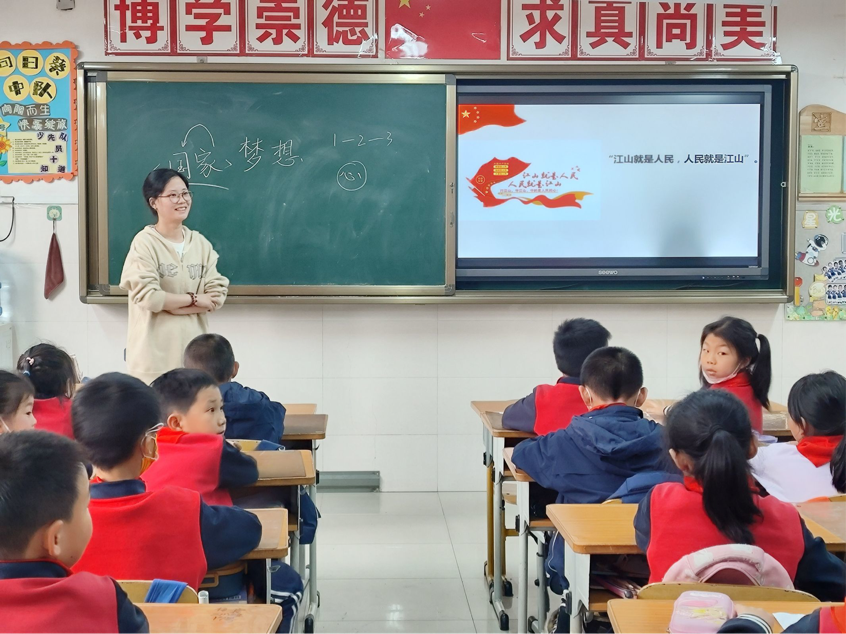 张依芳以《美丽中国是我的家》为题,通过播放歌曲《我爱你,中国》,让同学们寻找歌曲中赞美祖国的句子来抒发自己的爱国之情。