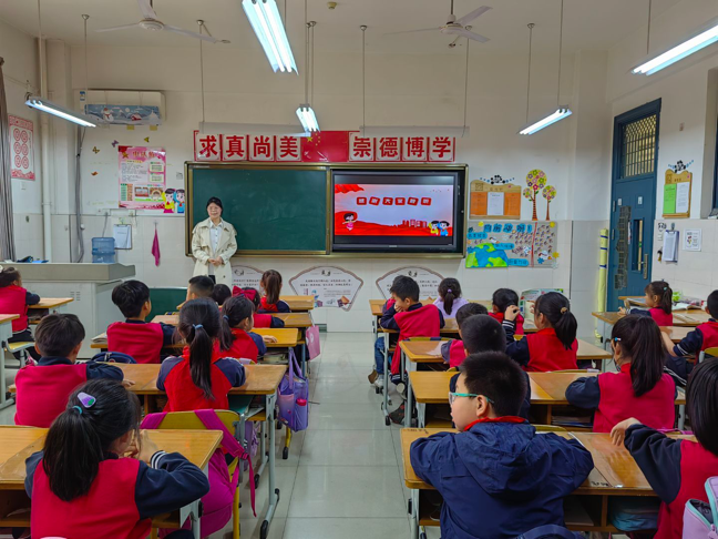 严文昭以《新时代新征程》为主题,分别从党的二十大、争做新时代好队员两方面展开,通过提问党的二十大相关内容引发了同学们的深入思考,并带领全体同学一起阅读习近平总书记的寄语,使同学们感受到了习近平总书记对孩子们的深切关怀,激励同学们立志做为国奉献的人。