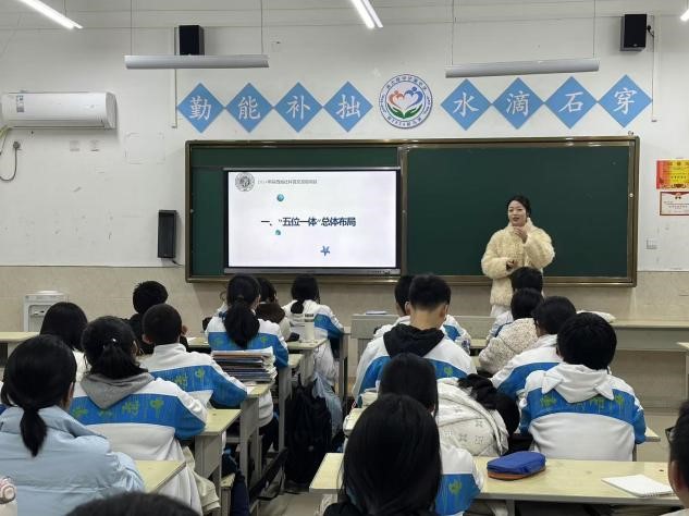 李旺盛在初二(1)班以《“五位一体”和“四个全面”》为题开展宣讲