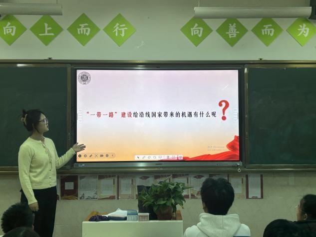 赵莹在初二(9)班以《携手构建人类命运共同体》为题开展宣讲