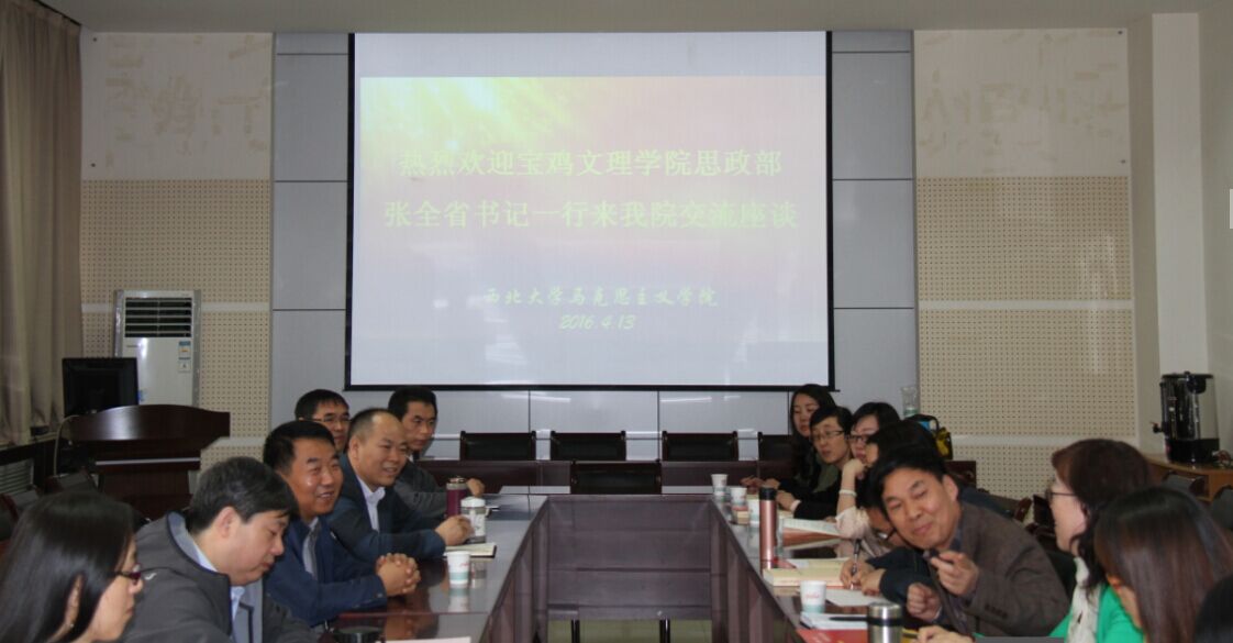 首先,杨洪院长将我院整体情况、队伍建设、学科建设向宝鸡文理学院各位老师做了简要介绍。接着王强副院长就我院思政课教学改革、实践教学、网络教学的开展情况做了补充。张全省书记高度概括了此行的目的和重要意义,对我院的接待表示了感谢。双方老师进行了深度的交流和沟通,并在友好的气氛中结束了此次活动。