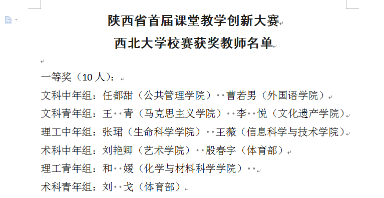 根据《关于开展陕西省首届课堂教学创新大赛西北大学校赛的通知》(西大教〔2018〕15号),经校评选委员会评选,我院王青老师获陕西省首届课堂教学创新大赛西北大学校赛文科青年组一等奖。