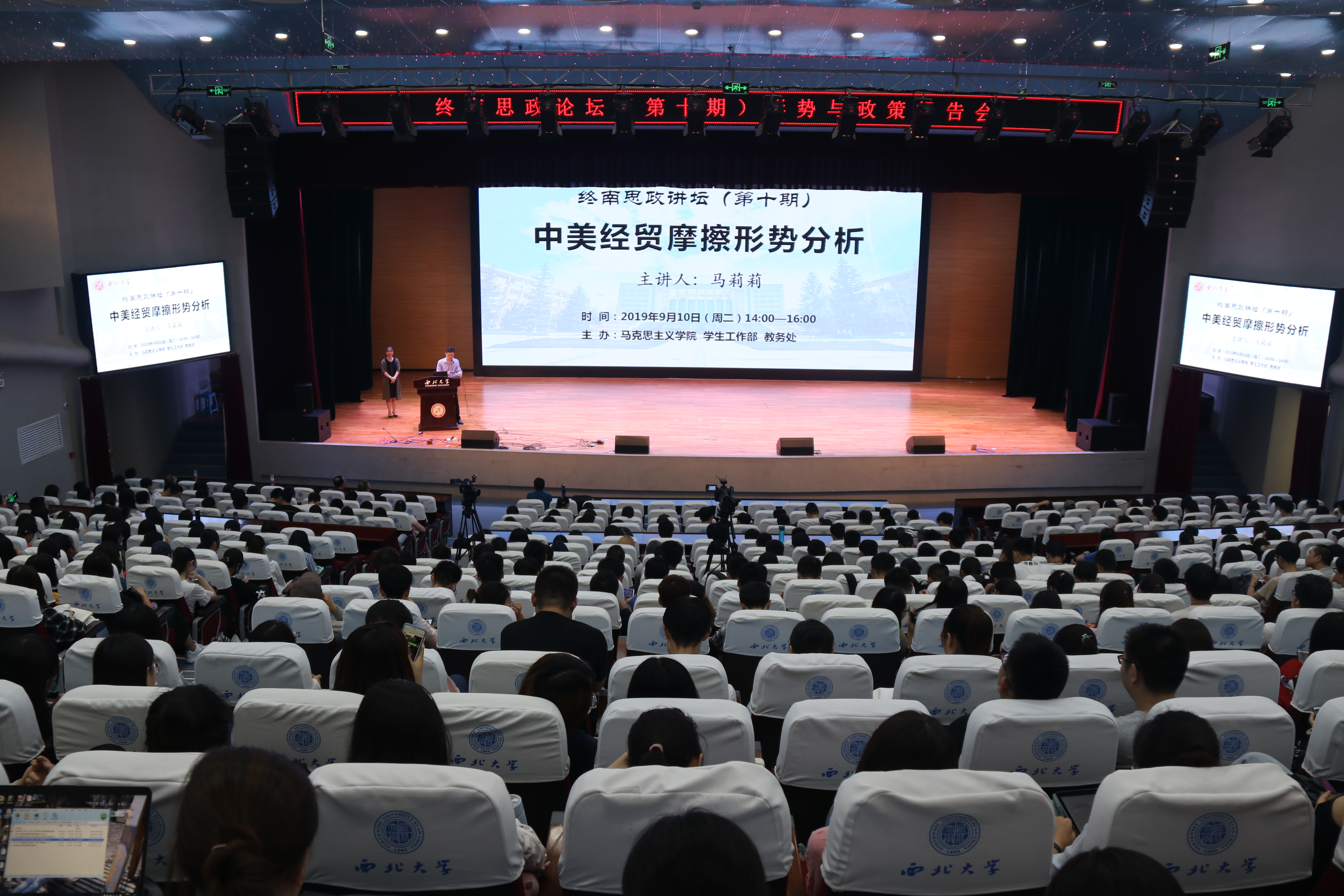 2019年9月10日下午,由我校马克思主义学院、学工部和教务处举办的终南思政论坛(第十期)形势与政策报告会在长安校区学生活动中心报告厅成功举行。西北大学经济管理学院副院长、博士生导师马莉莉教授做了“中美经贸摩擦探析”的报告。本次报告是我校为了推进新时代“形势与政策”课的教学改革,落实教育部关于“形势与政策”课规范开课,保证学生在校学习期间开课不断线的要求针对本科三、四年级学生举办的首场报告会,约600名长安校区三、四年级本科学生听取了报告。